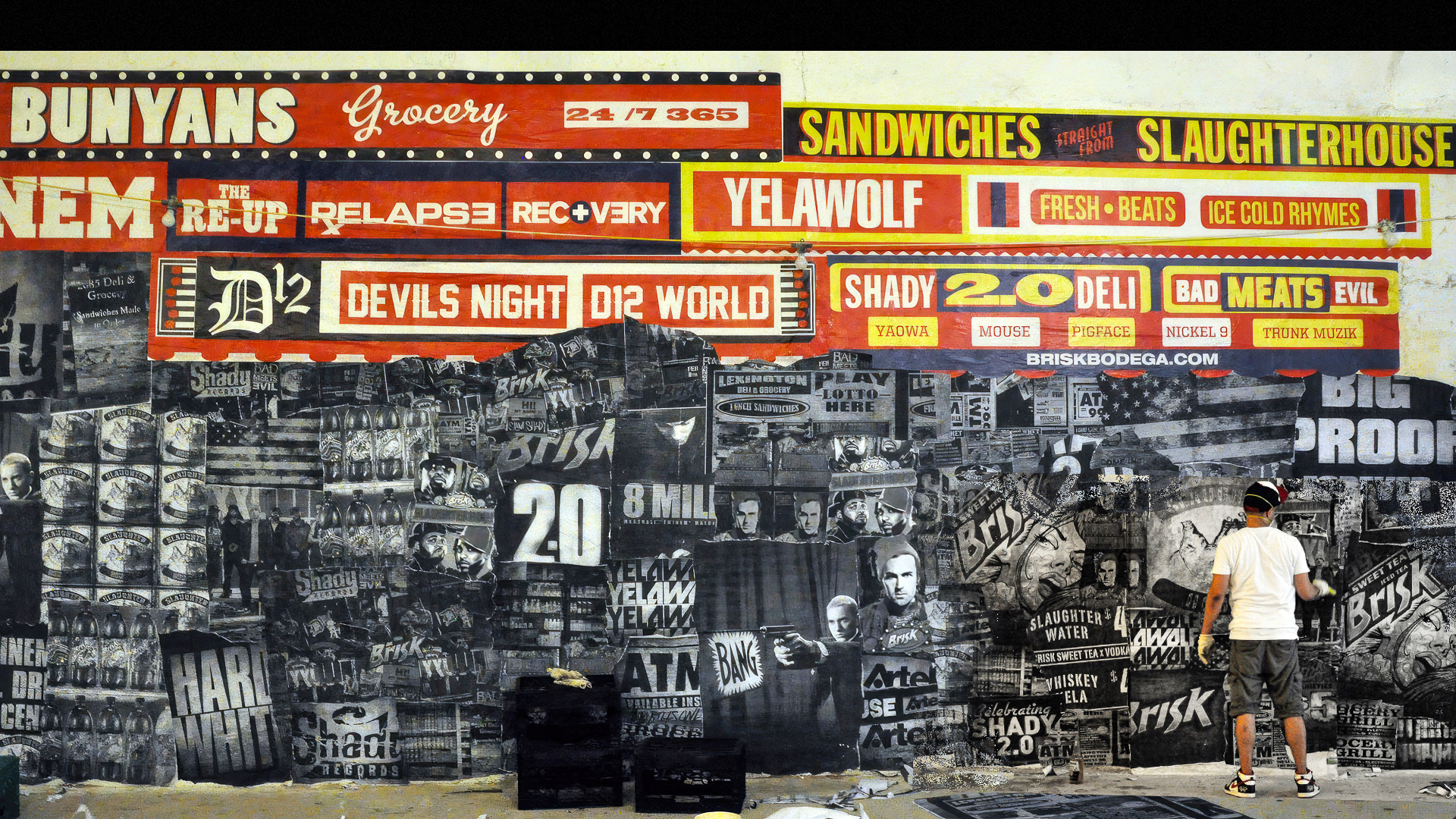 We treated Brisk Bodega as world-building, not a marketing event. The goal was to make the space feel found, not fabricated—grounded in real bodega cues like signage, typography, lighting, and texture, then reinterpreted with Shady Records attitude through hand-painted elements, collage, and hidden narrative moments throughout.