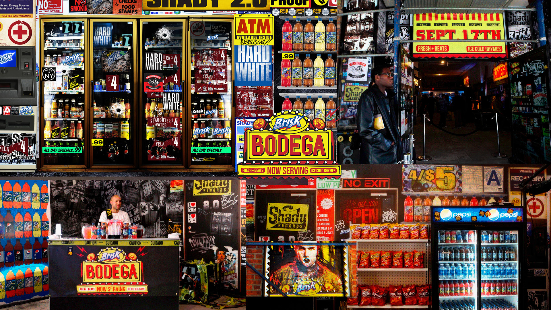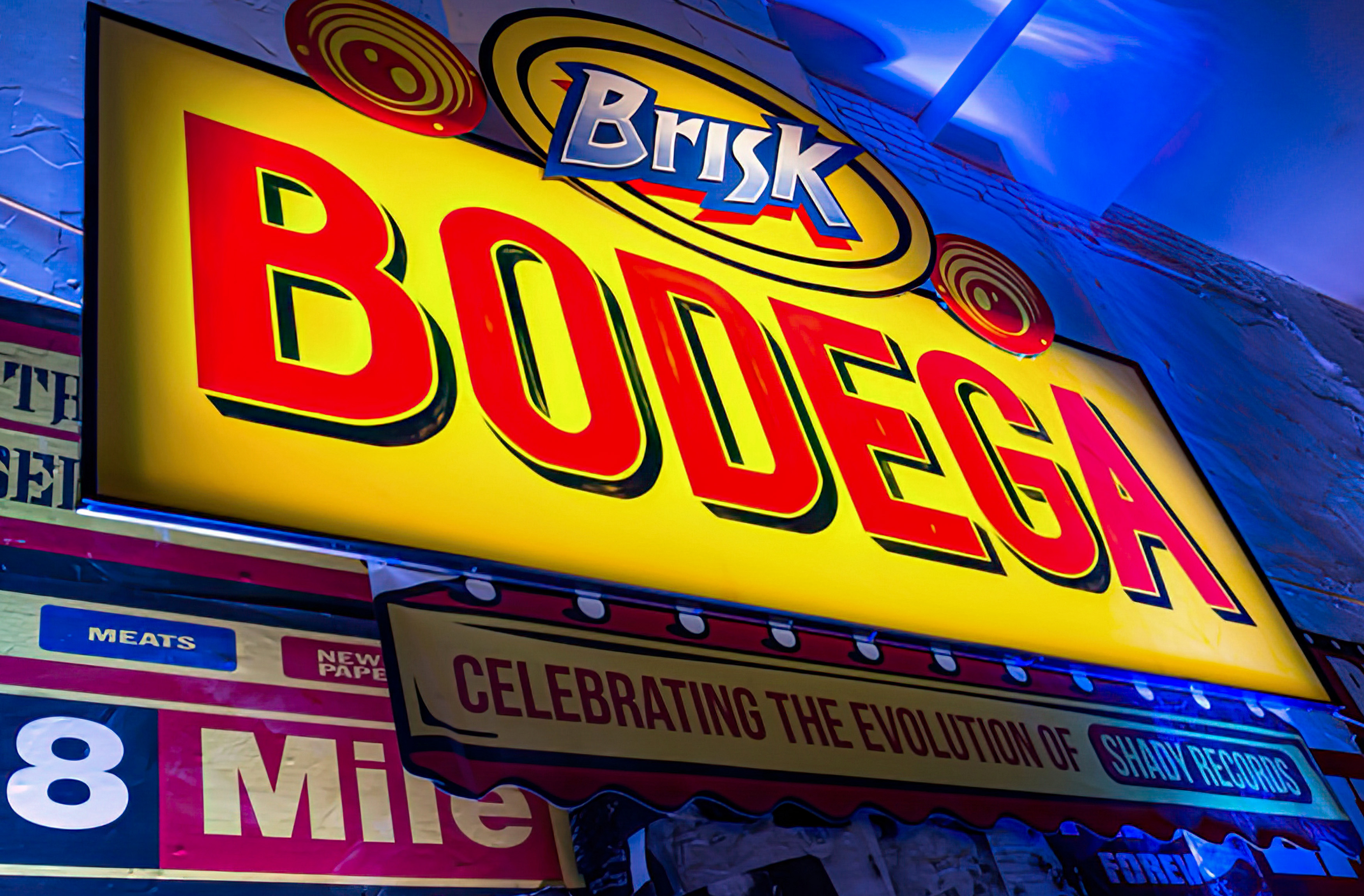 Transform a 5,000 sq ft venue into a functioning NYC bodega that felt authentic while integrating Brisk and Shady Records seamlessly. The main room needed to operate as an open gallery for performance and interaction, while a back room became a Shady Records museum—built from memorabilia, murals, and story-driven design details.