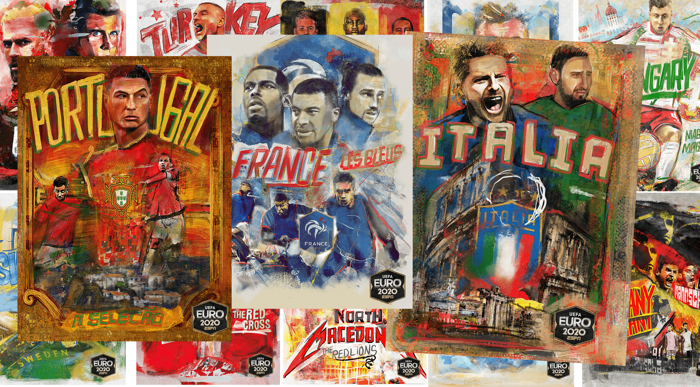 The collection became a centerpiece of ESPN’s Euro 2020 storytelling—shared across broadcasts and digital channels and embraced by fans as collectible art that united sport, culture, and national pride.